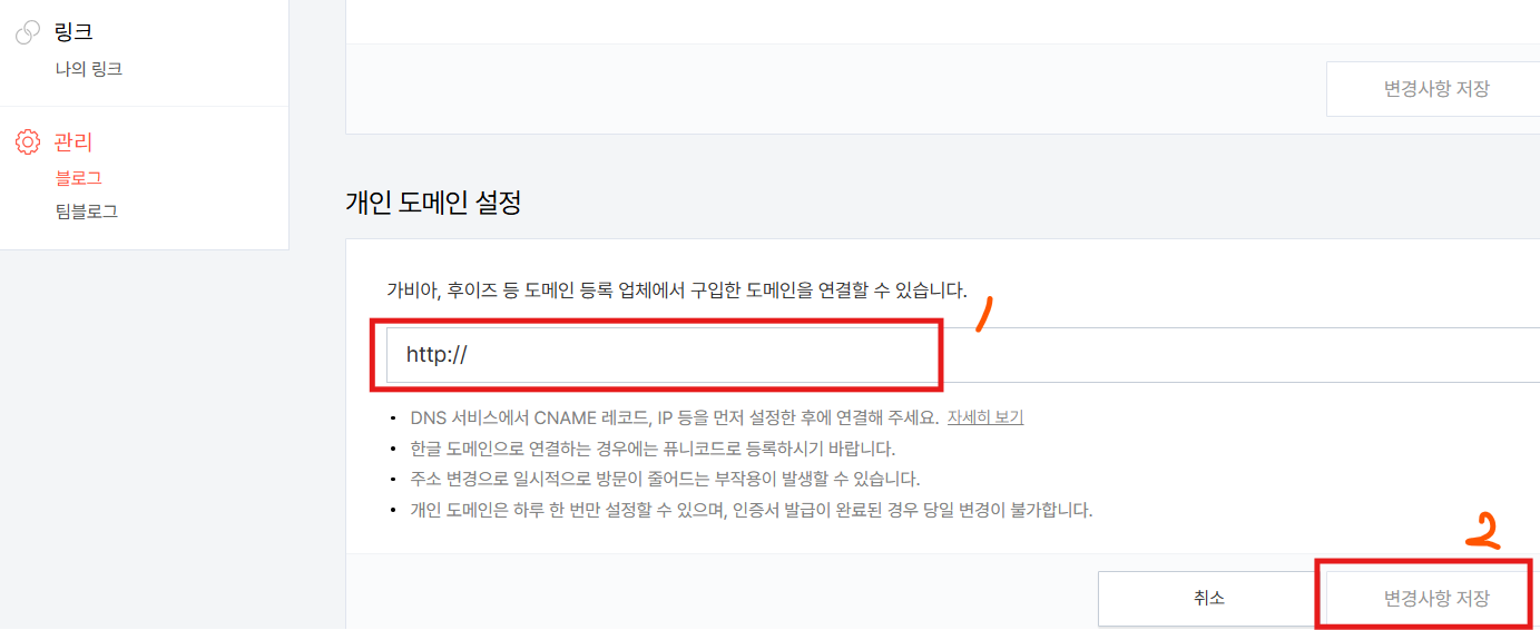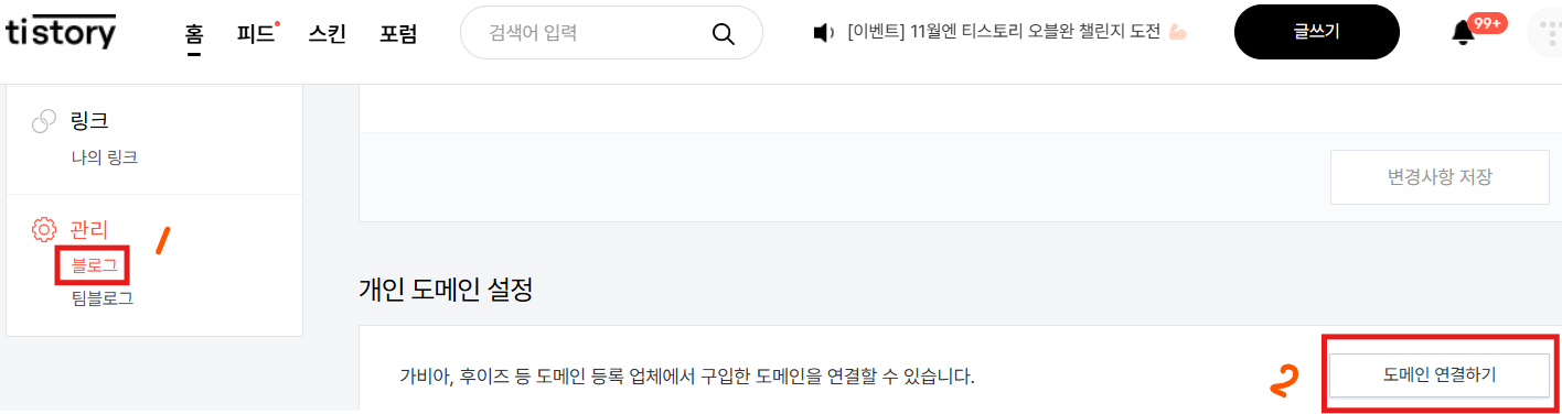 1. 블로그관리 : 블로그 → 도메인 연결하기
