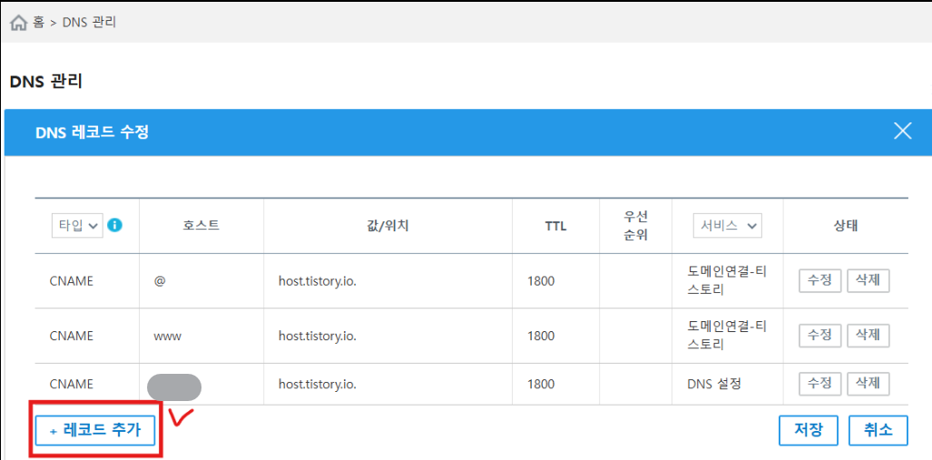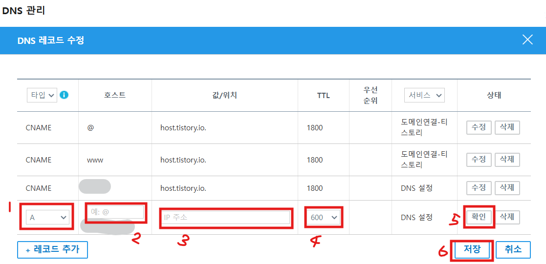| 1. 타입 : A → CNAME 2. 호스트 : 공백 → 자신이 원하는 숫자 or 영문자 로 만들어줌 3. 값/위치 : 위와 동일하게 host.tistory.io. 입력 4. TTL : 600 → 1800 선택 5. 확인 6. 저장 |