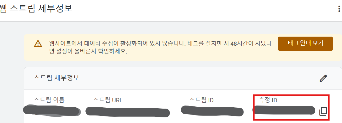 - 데이터 스트림 설정 : 웹사이트 url , 블로글 이름