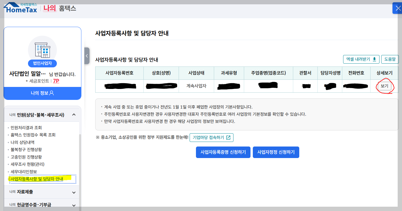 3. 사업자등록사항 및 담당자 안내 클릭→상세보기