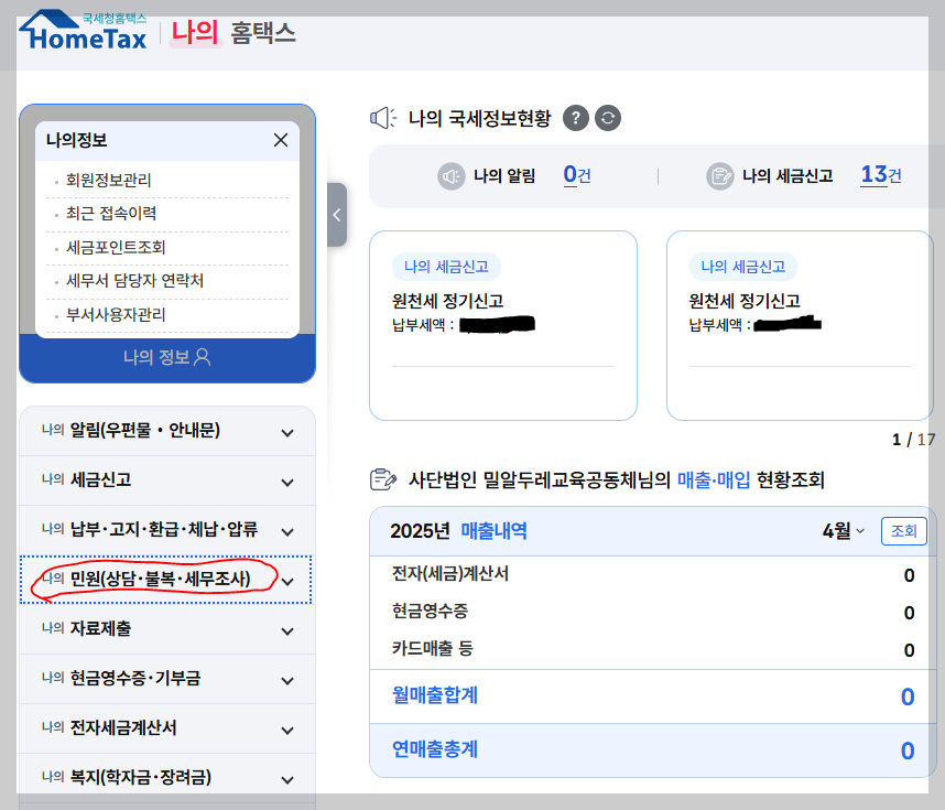 1. 홈택스 접속 → 나의 홈택스 클릭