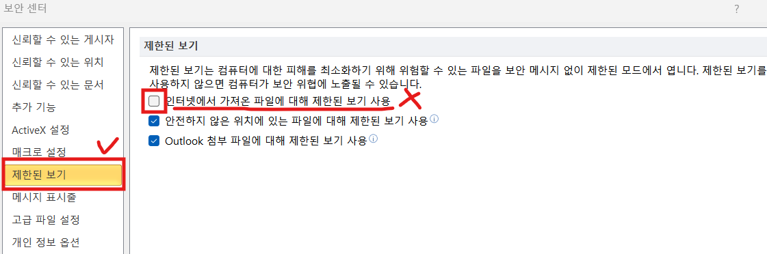제한된 보기 클릭 후, 인터넷에서 가져온 파일에 대해 제한된 보기 사용의 체크를 해제해 줍니다.