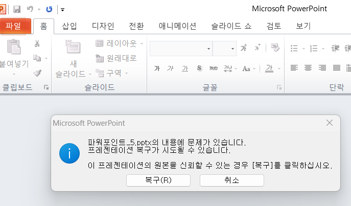 파워포인트 파일을 전송받아서 열기를 했는데, " 파일명.pptx의 내용에 문제가 있습니다. 프레젠테이션 복구가 시도될 수 있습니다. 이 프레젠테이션의 원본을 신뢰할 수 있는 경우 [복구]를 클릭하십시오." 라는 경고창이 뜰 때 당황했던 적이 있으신가요?