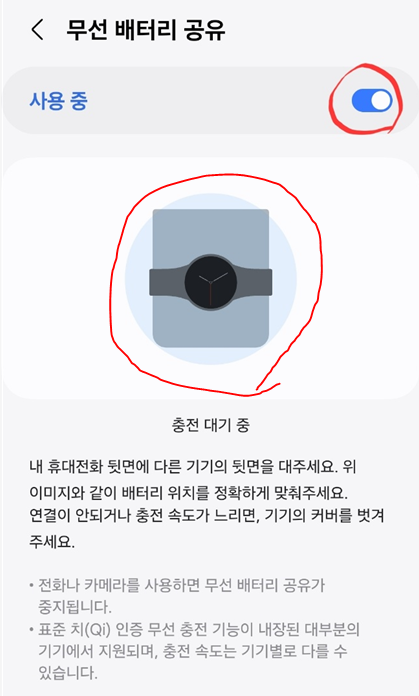 4. 핸드폰 뒷면에 워치 올려서 충전하기