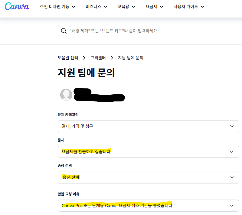 canva 구독해지 기간을 놓쳐서 이미 자동결제승인이 되어 환불을 요청해야 할 때 화면이 새롭게 구성되면서 바로 고객지원센터 찾기가 어려운 경우가 있습니다.